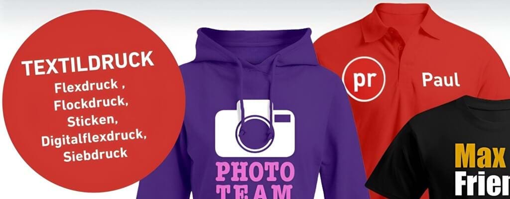 darunter Siebdruck, Flexdruck, Flockdruck und Digitaldruck auf